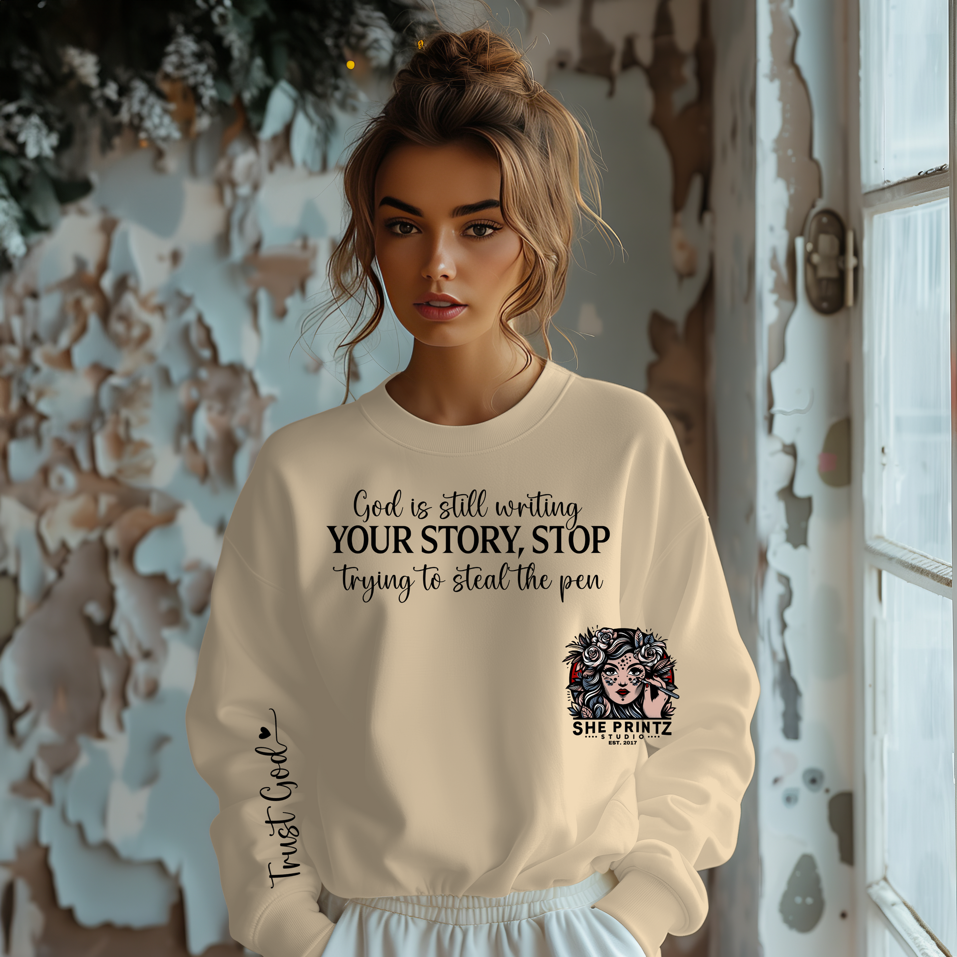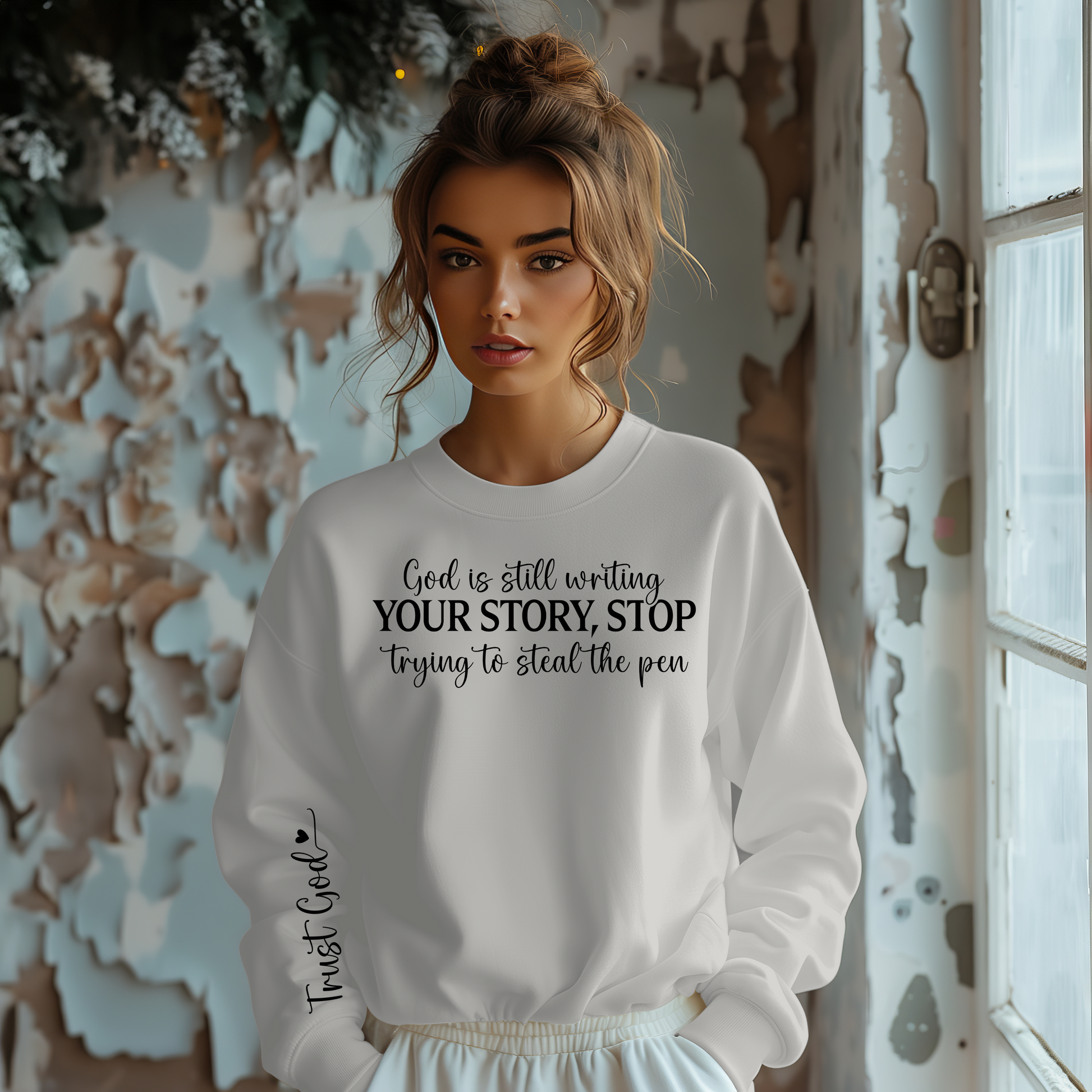 "Embrace the power of faith and trust God with this cozy sweatshirt. Perfect for the season, it reminds us to let go of worries and have faith in a higher power. Stay warm and inspired with this sweatshirt!"